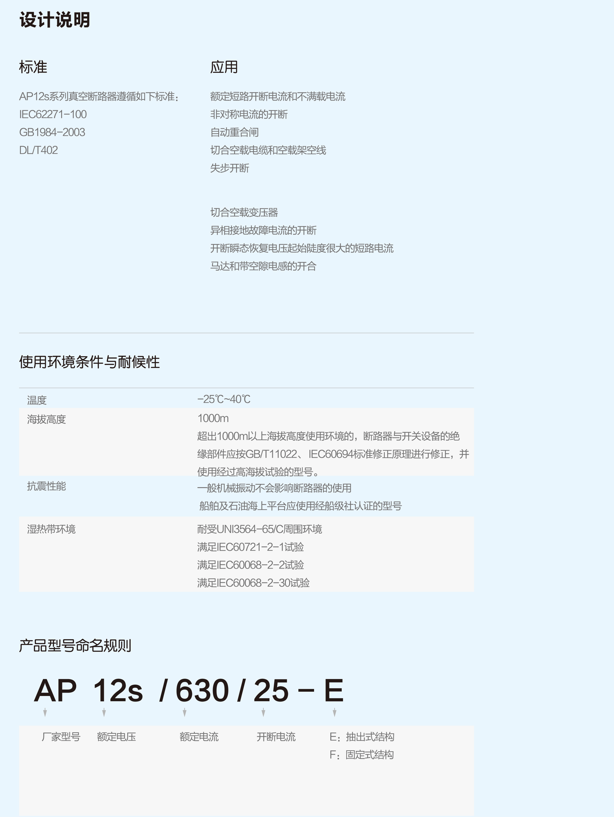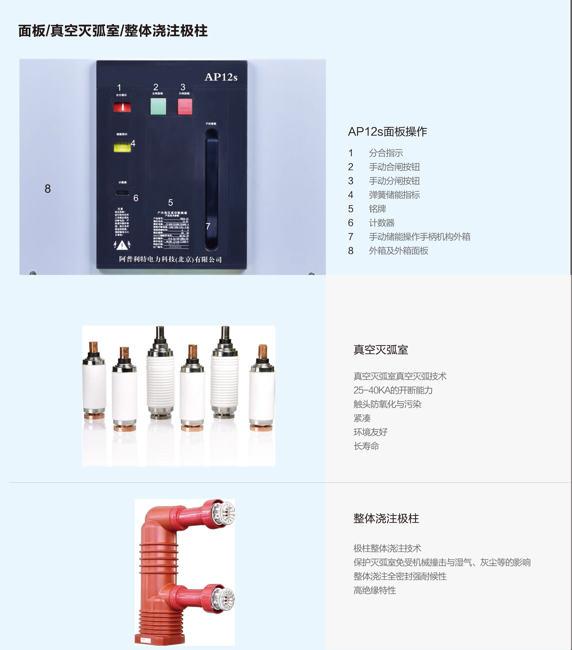 AP12n型真空断路器引进国外先进的灭弧享整体浇注技术与高可靠性模块化操作机构技术,简洁朴素的设计理念与数字化制造工艺带来了断路器的高可靠性、高互换性、操作维护便捷的特点。